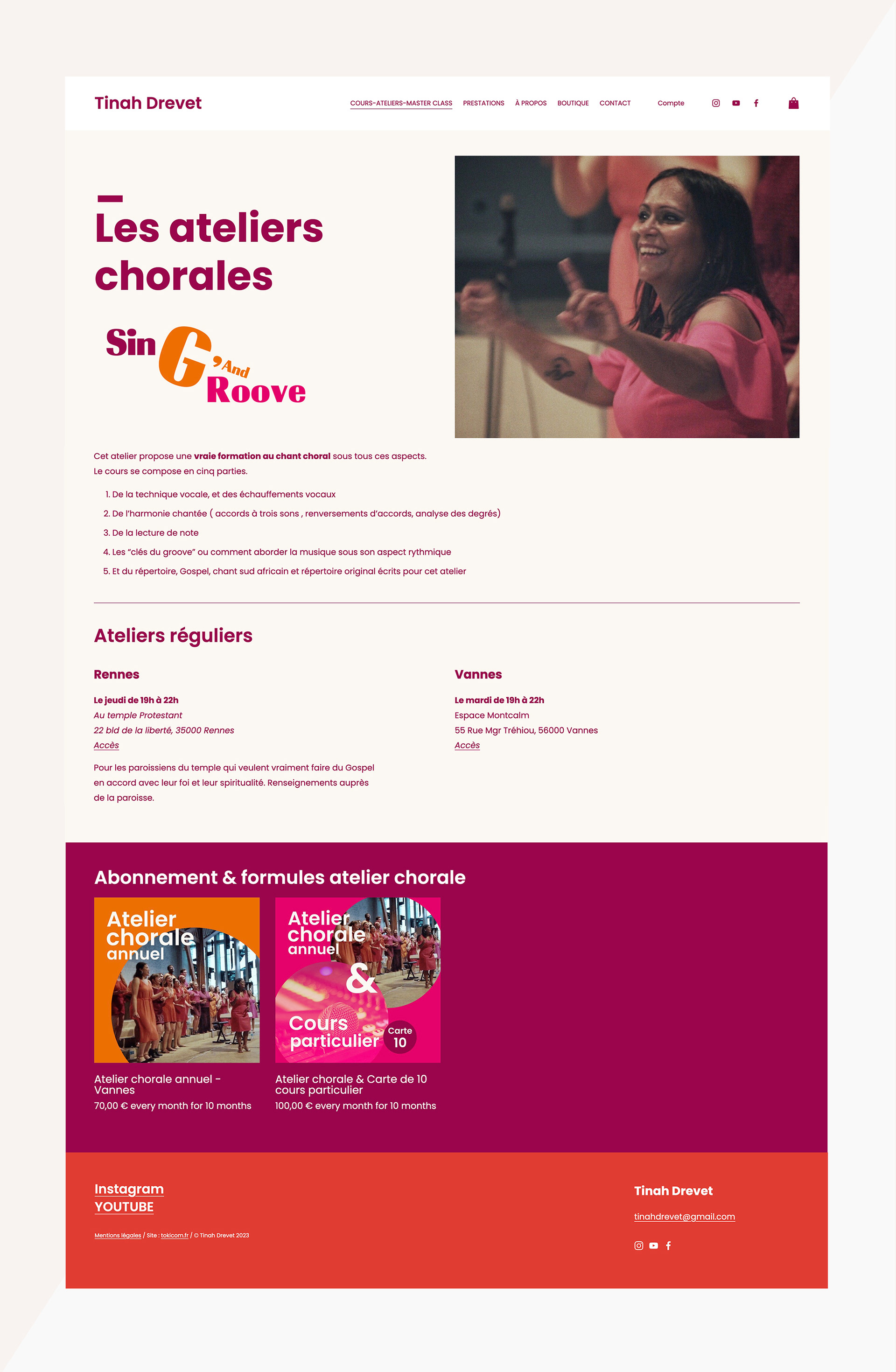 Création, intégration et mise en ligne du site web / Espace de vente en ligne des cours individuels et abonnements chorale.